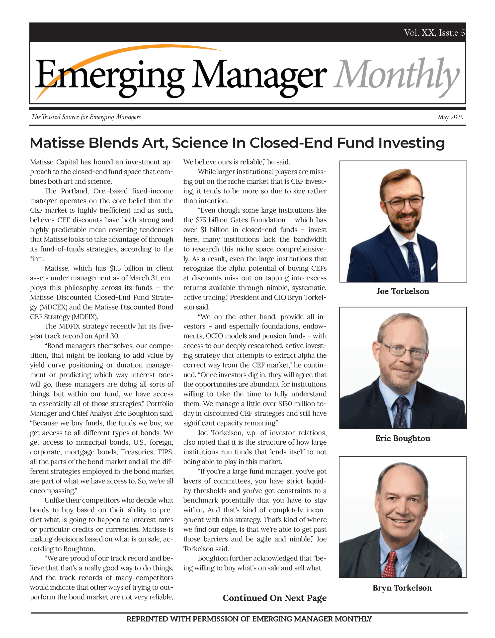 Our team was featured in the May 2025 issue of Emerging Manager Monthly in Matisse Blends Art, Science In Closed-End Fund Investing. The article was written by Lindsay Saienni and published on May 7th, 2025.